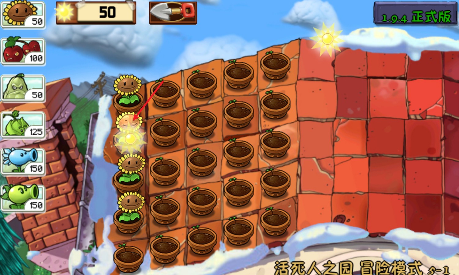 2、随后正式开始,先种植能够产生阳光的向日葵。